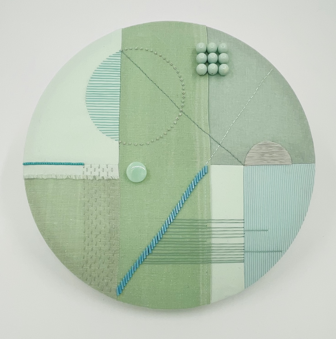 geometrics no.4, bomuld, hør og perler, 13 cm Ø, 2023